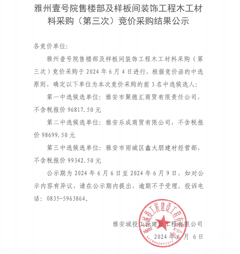 雅州壹號院售樓部及樣板間裝飾工程木工材料采購(第三次)競價(jià)采購結(jié)果公示