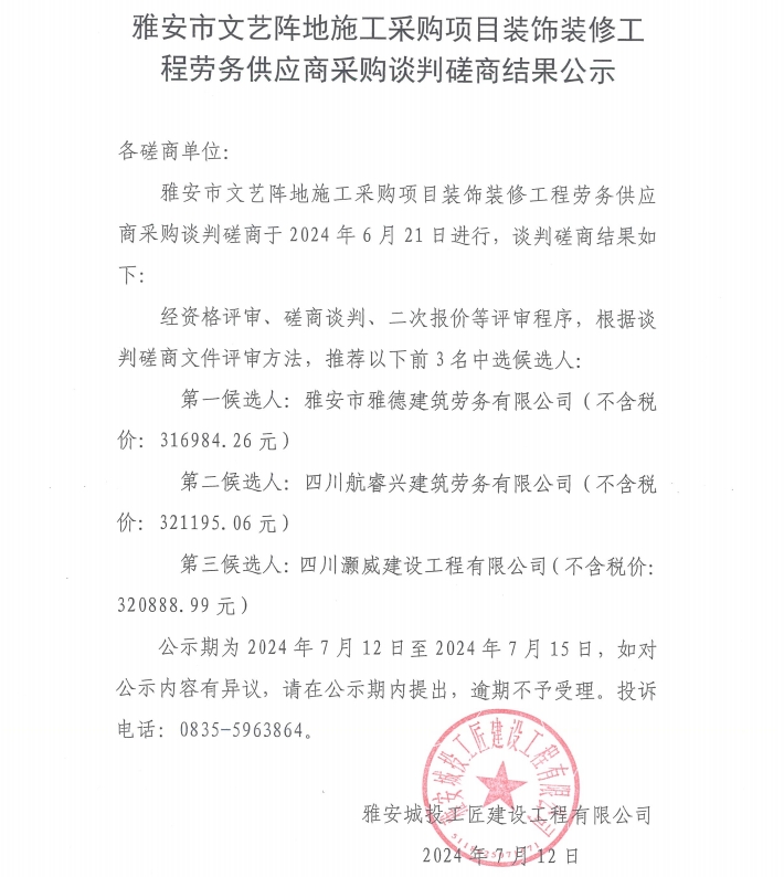 雅安市文藝陣地施工采購項(xiàng)目裝飾裝修工程勞務(wù)供應(yīng)商采購談判磋商結(jié)果公示