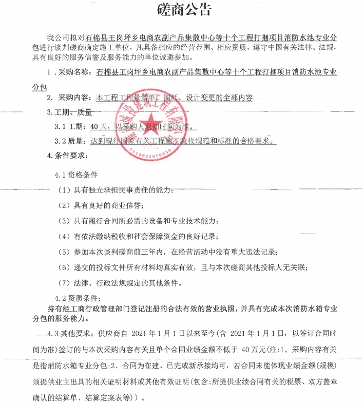 石棉縣王崗坪鄉(xiāng)電商農(nóng)副產(chǎn)品集散中心等十個工程打捆項(xiàng)目消防水池專業(yè)分包談判磋商公告