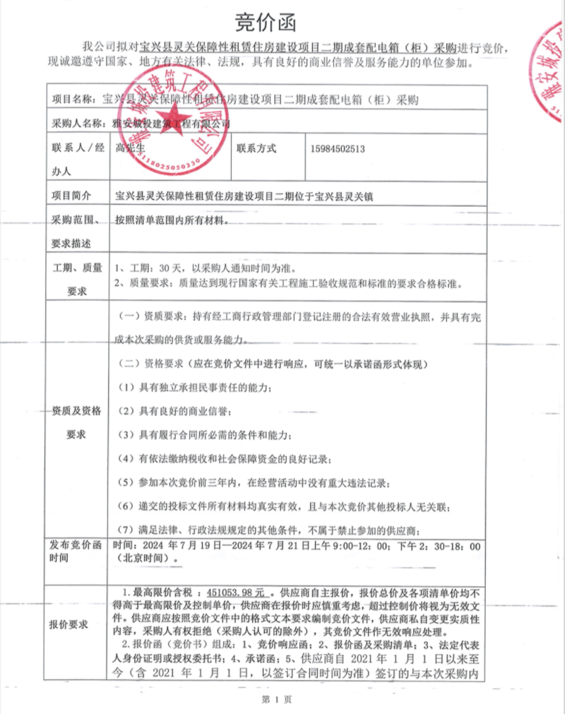 寶興縣靈關(guān)保障性租賃住房建設(shè)項(xiàng)目二期成套配電箱(柜)采購競價(jià)公告