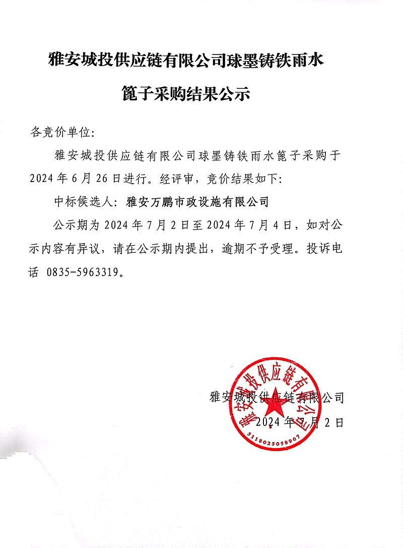 雅安城投供應鏈有限公司球墨鑄鐵雨水篦子采購結果公示