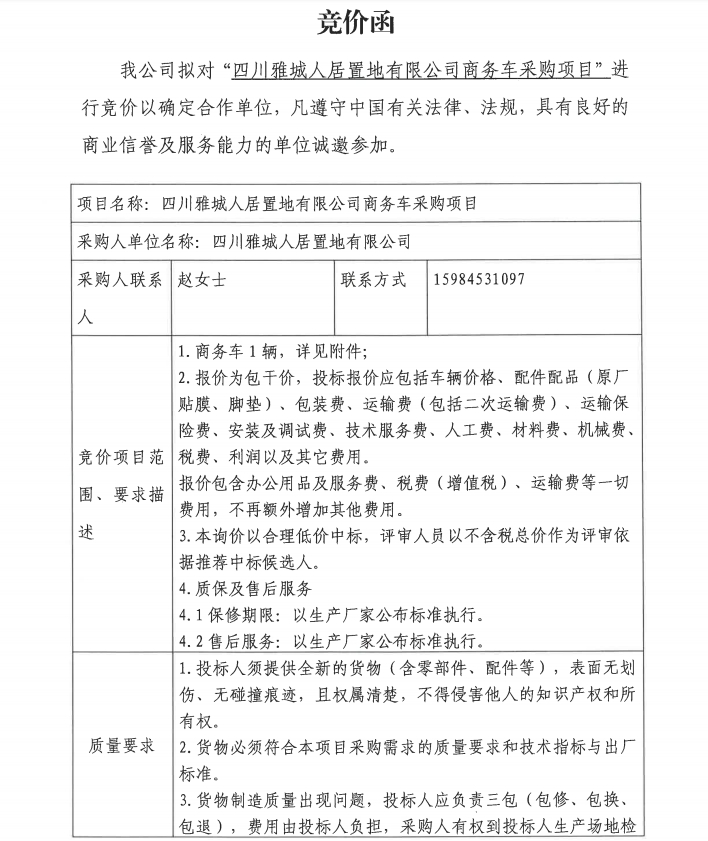 四川雅城人居置地有限公商務(wù)車采購(gòu)項(xiàng)目競(jìng)價(jià)公告
