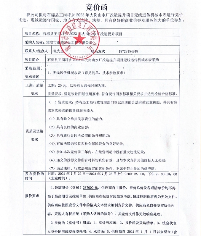2023年大崗山水廠改造提升項(xiàng)目無(wú)線遠(yuǎn)傳機(jī)械水表競(jìng)價(jià)函
