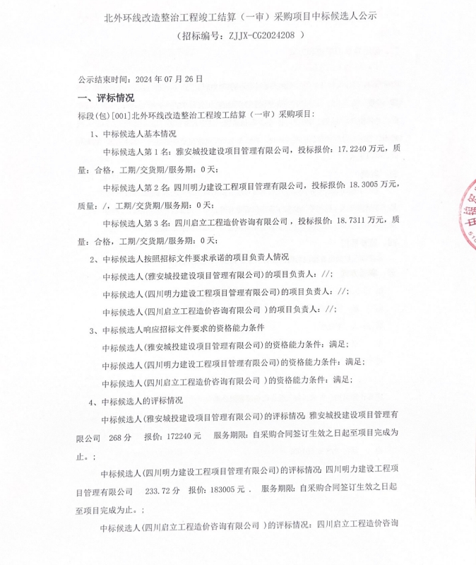 北外環(huán)線改造整治工程竣工結算(一審)采購項目中標候選人公示