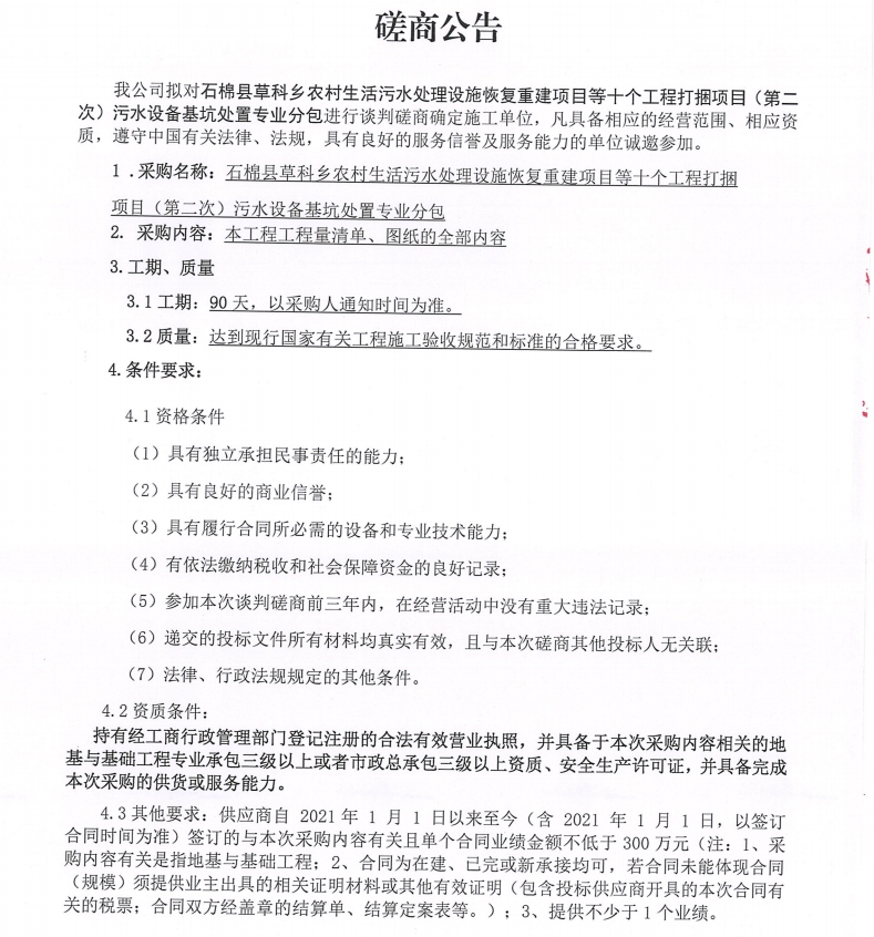 石棉縣草科鄉(xiāng)農(nóng)村生活污水處理設施恢復重建項目等十個工程打捆項目(第二次) 污水設備基坑處置專業(yè)分包采購談判磋商公告