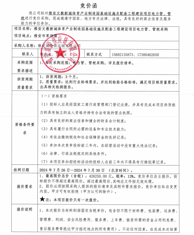 雅安文教新城體育產(chǎn)業(yè)制造園基礎(chǔ)設(shè)施及配套工程建設(shè)項(xiàng)目電力管、管枕采購競價(jià)公告