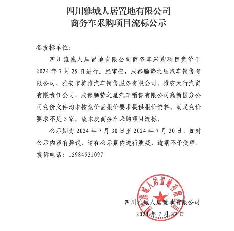 四川雅城人居置地有限公司商務(wù)車(chē)采購(gòu)項(xiàng)目流標(biāo)公示