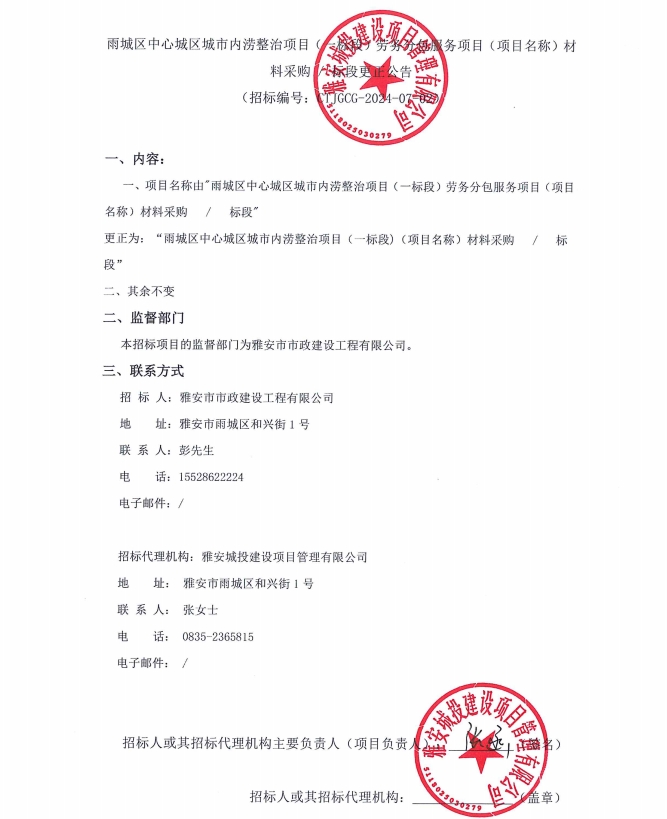 雨城區(qū)中心城區(qū)城市內(nèi)澇整治項目(一標段)勞務分包服務項目(項目名稱)材料采購/標段更正公告