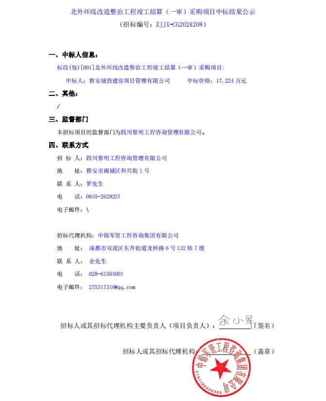 北外環(huán)線改造整治工程竣工結(jié)算(一審)采購項目中標結(jié)果公示