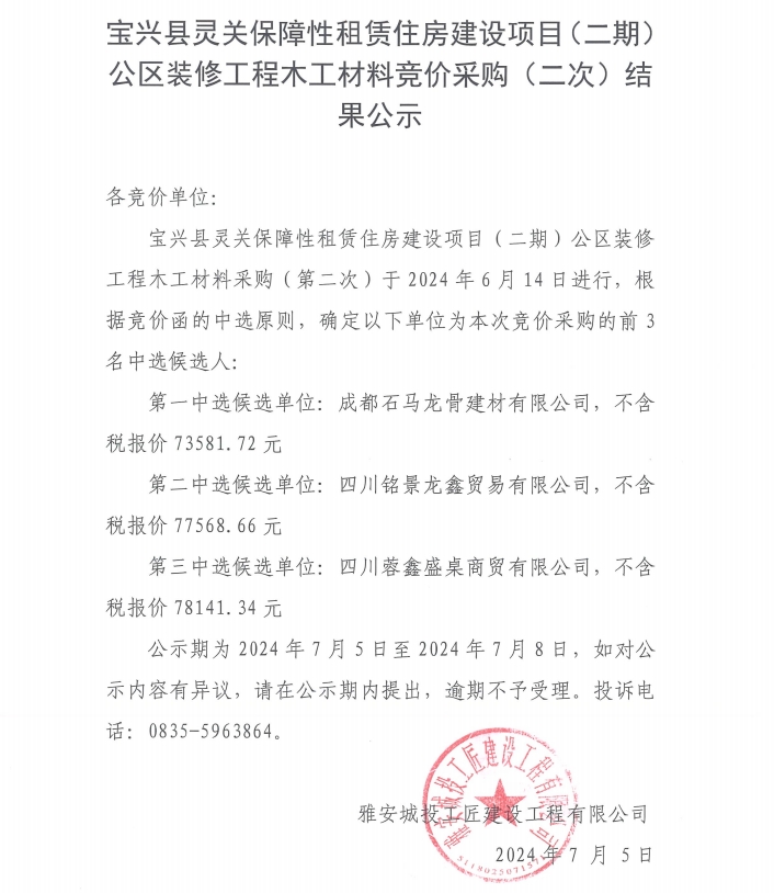 寶興縣靈關保障性租賃住房建設項目(二期)公區(qū)裝修工程木工材料競價采購(二次)結果公示