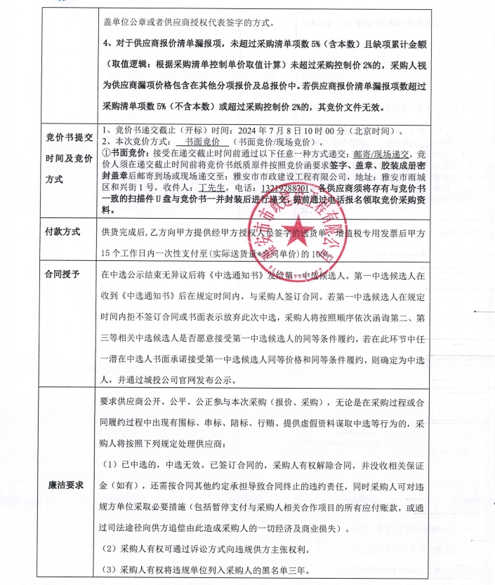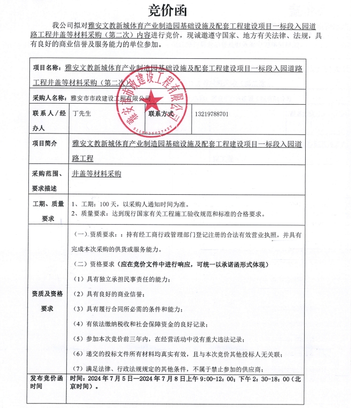 雅安文教新城體育產(chǎn)業(yè)制造園基礎(chǔ)設(shè)施及配套工程建設(shè)項目一標(biāo)段入園道路工程井蓋等材料采購(第二次)競價公告