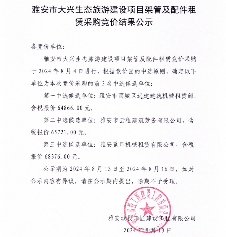 雅安市大興生態(tài)旅游建設(shè)項(xiàng)目架管及配件租賃采購競(jìng)價(jià)結(jié)果公示