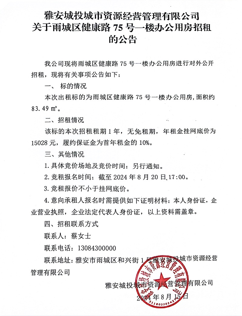 雅安城投城市資源經(jīng)營管理有限公司關(guān)于雨城區(qū)健康路75號一樓辦公用房招租的公告