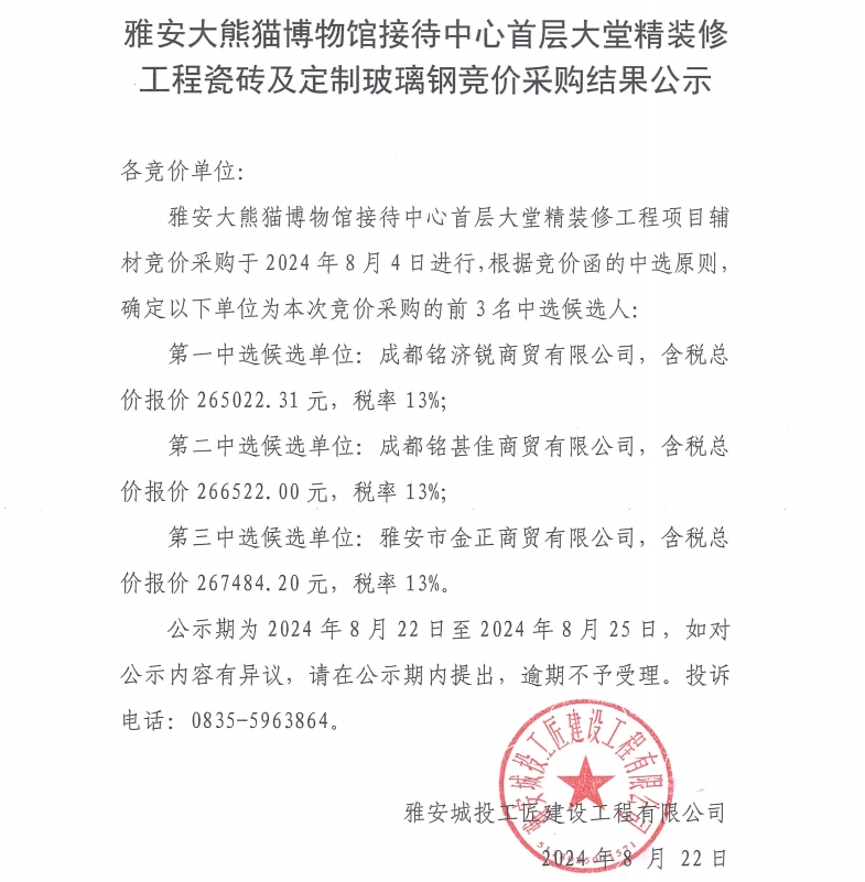 雅安大熊貓博物館接待中心首層大堂精裝修工程瓷磚及定制玻璃鋼競(jìng)價(jià)采購(gòu)結(jié)果公示
