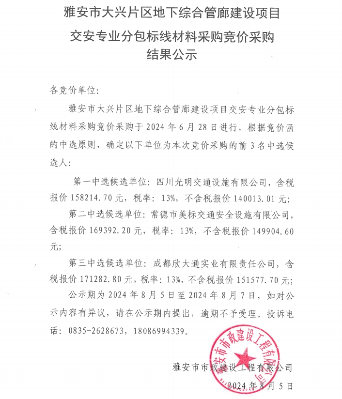 雅安市大興片區(qū)地下綜合管廊建設項目道路專業(yè)分包標線材料采購競價采購結果公示