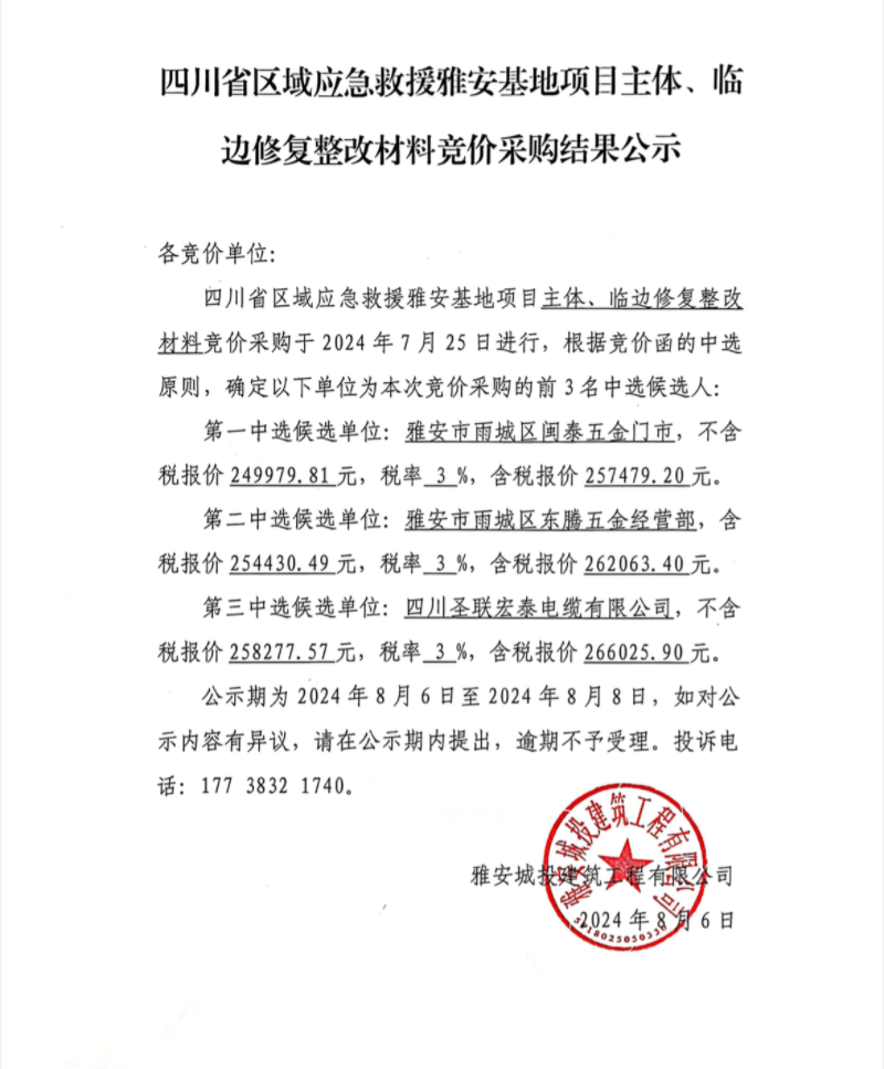 四川省區(qū)域應(yīng)急救援雅安基地項目主體、臨邊修復(fù)整改材料競價采購結(jié)果公示