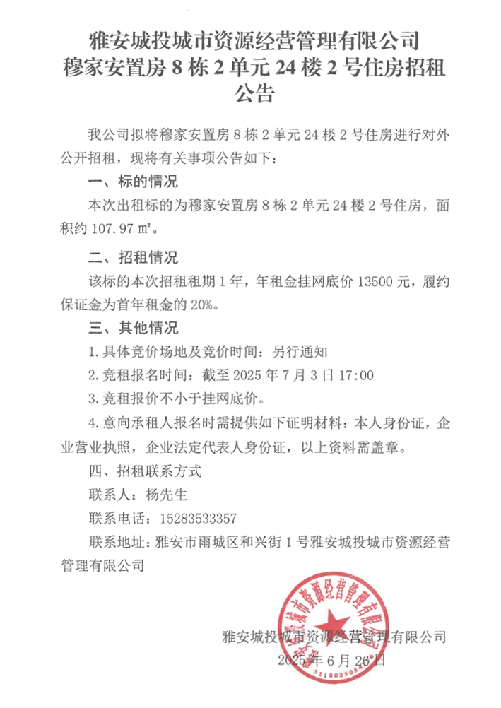雅安城投城市資源經(jīng)營(yíng)管理有限公司穆家安置房8棟2單元24樓2號(hào)住房招租公告