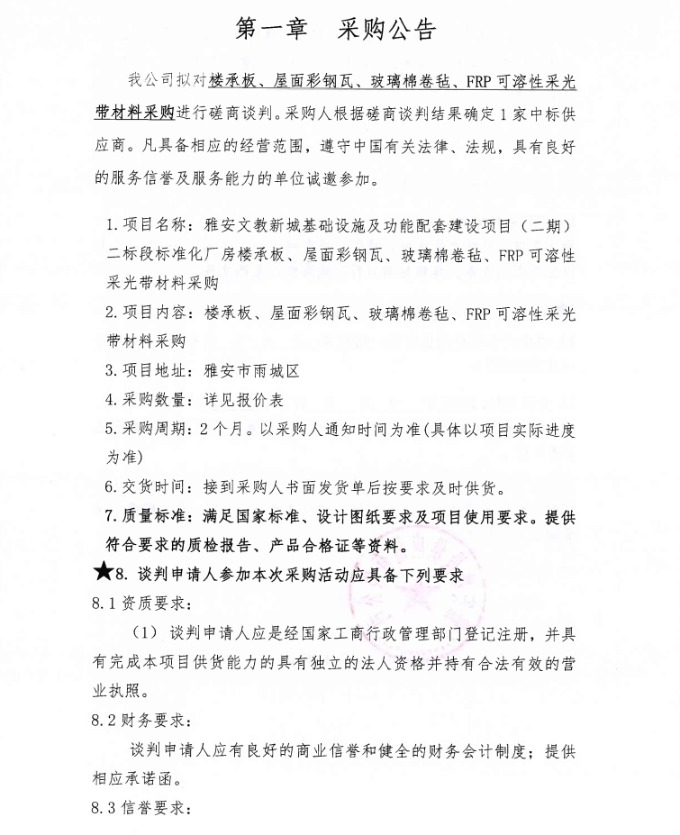 雅安文教新城基礎(chǔ)設(shè)施及功能配套建設(shè)項目(二期)二標(biāo)段標(biāo)準(zhǔn)化廠房樓承板、屋面彩鋼瓦、玻璃棉卷氈、FRP可溶性采光帶材料采購公告