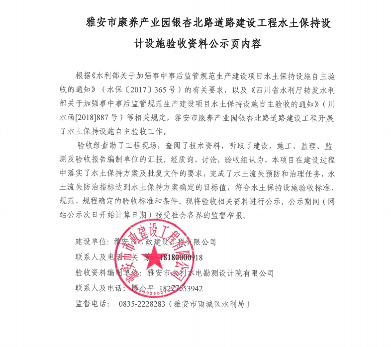 雅安市康養(yǎng)產(chǎn)業(yè)園銀杏北路道路建設(shè)工程水土保持設(shè)計(jì)設(shè)施驗(yàn)收資料公示頁內(nèi)容