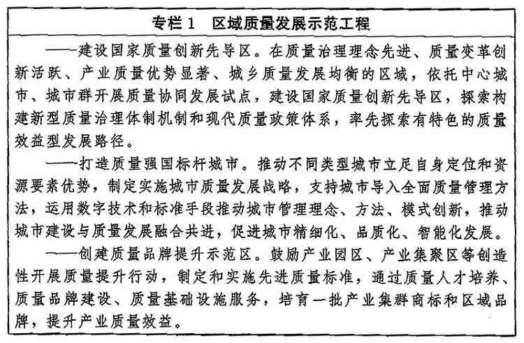 (八)提升產(chǎn)業(yè)集群質(zhì)量引領(lǐng)力。支持先導(dǎo)性、支柱性產(chǎn)業(yè)集群加強(qiáng)先進(jìn)技術(shù)應(yīng)用、質(zhì)量創(chuàng)新、質(zhì)量基礎(chǔ)設(shè)施升級(jí),培育形成一批技術(shù)質(zhì)量?jī)?yōu)勢(shì)突出、產(chǎn)業(yè)鏈融通發(fā)展的產(chǎn)業(yè)集群。深化產(chǎn)業(yè)集群質(zhì)量管理機(jī)制創(chuàng)新,構(gòu)建質(zhì)量管理協(xié)同、質(zhì)量資源共享、企業(yè)分工協(xié)作的質(zhì)量發(fā)展良好生態(tài)。組建一批產(chǎn)業(yè)集群質(zhì)量標(biāo)準(zhǔn)創(chuàng)新合作平臺(tái),加強(qiáng)創(chuàng)新技術(shù)研發(fā),開展先進(jìn)標(biāo)準(zhǔn)研制,推廣卓越質(zhì)量管理實(shí)踐。依托國(guó)家級(jí)新區(qū)、國(guó)家高新技術(shù)產(chǎn)業(yè)開發(fā)區(qū)、自由貿(mào)易試驗(yàn)區(qū)等,打造技術(shù)、質(zhì)量、管理創(chuàng)新策源地,培育形成具有引領(lǐng)力的質(zhì)量卓越產(chǎn)業(yè)集群。